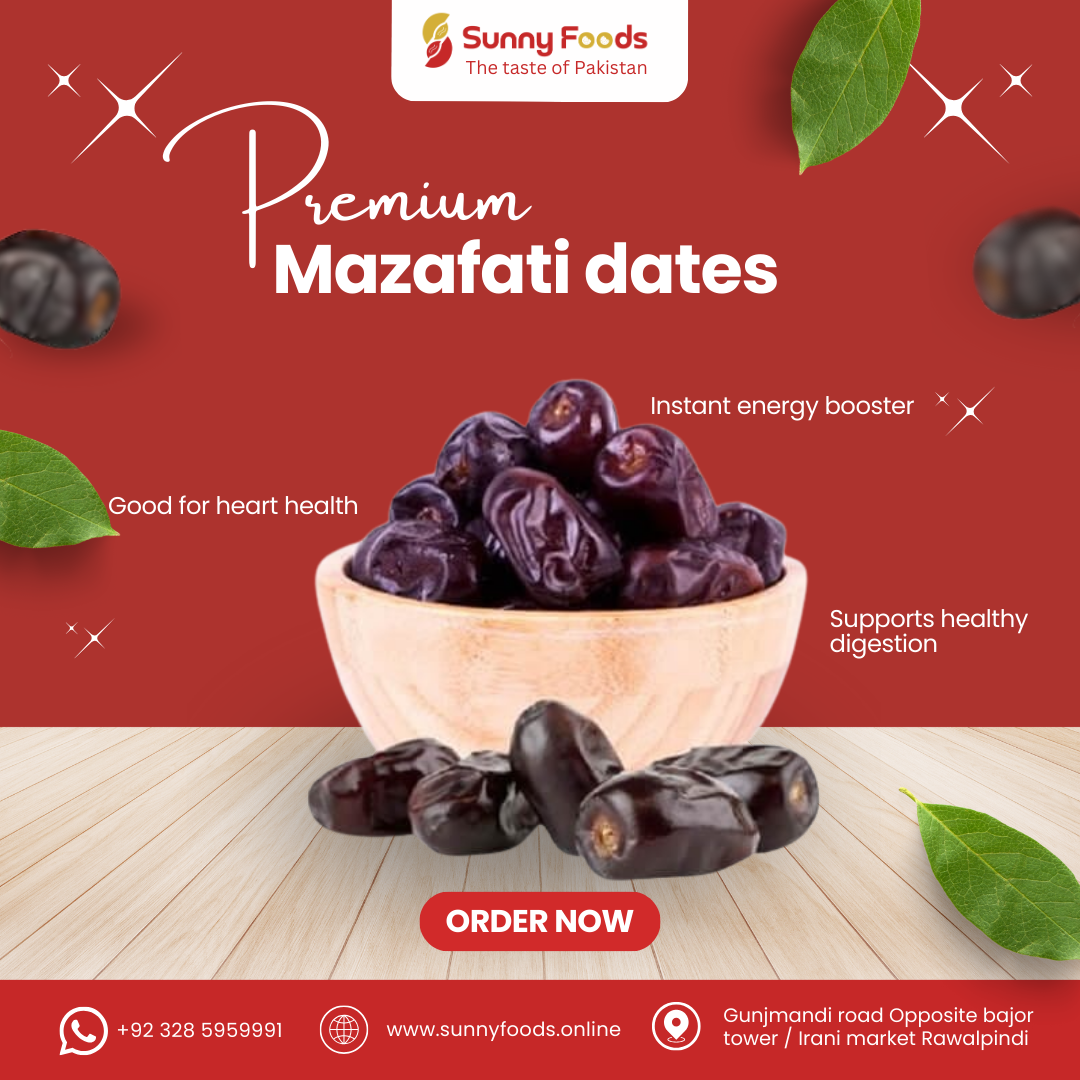 Enjoy the rich taste of Mazafati Dates from Sunny Foods, carefully selected for freshness, softness, and natural sweetness. These premium-quality dates are an ideal choice for Sehri and Iftar, providing instant energy after fasting while supporting digestion and heart health.